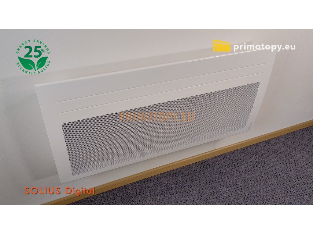Sálavý přímotop Solius Digital 15 o výkonu 1500W, určený pro úsporné a komfortní trvalé vytápění, nárazové vytápění nebo přitápění. Bezhlučné polovodičové spínání s rychlým nástupem sálání a tepelné pohody. Solius Digital vybaven digitálním termostatem s týdenním programem. Kromě programu je možné přepnout také do jednoduchého manuálního režimu, kdy je přehledně vidět nastavená a změřená teplota. Přímotop Solius Digital kombinuje komfortní a úsporný provoz infrapanelů s dynamikou, vysokým výkonem a kompaktními rozměry přímotopů. Více než polovina tepelného výkonu je vyprodukována ve formě sálání, neboli infračerveného vlnění, což je podstatou úsporného provozu. Ve směru sálání konvektoru je vlivem emise tepelného vlnění také částečně eliminován efekt tzv. "studené podlahy" zvýšením její povrchové teploty. V porovnání s klasickými přímotopnými konvektory se jedná se o výrazně úspornější topidlo, v závislosti na provozních podmínkách a výšce stropu o 20-30%. Hybridní sálavé přímotopy jsou vhodné pro trvalé nebo přechodné vytápění prostor s důrazem na nízké provozní náklady a vysoký topný výkon. Přímotopy Solius Digital jsou určené k pevné instalaci na stěnu a připojením přívodních vodičů do instalační krabice, ale jsou vybaveny i vidlicí pro připojení do zásuvky (odstraněním vidlice nezaniká nárok na záruku). Topidla Solius Digital nejsou vybavena pádovou pojistkou a proto nejsou určena pro montáž nožiček. Provoz v jednoduchém manuálním režimu, nebo s nastaveným programem.