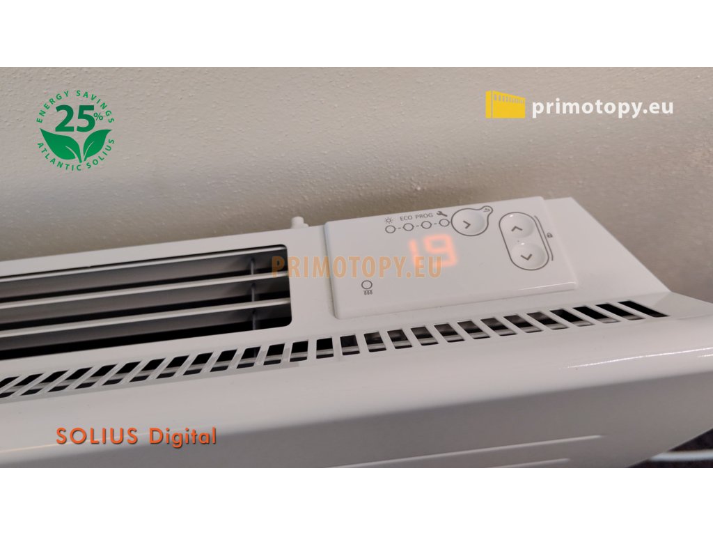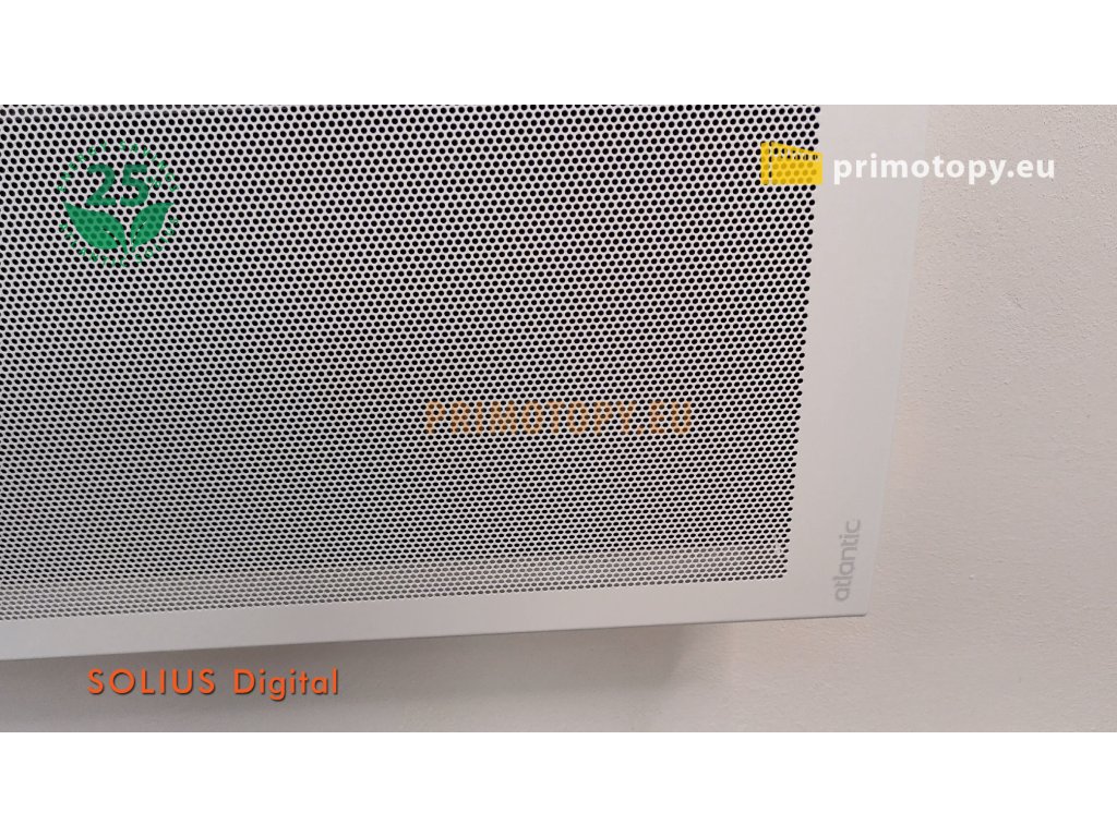 Sálavý přímotop Solius Digital 20 o výkonu 2000W, určený pro úsporné a komfortní trvalé vytápění, nárazové vytápění nebo přitápění. Bezhlučné polovodičové spínání s rychlým nástupem sálání a tepelné pohody. Solius Digital vybaven digitálním termostatem s týdenním programem. Kromě programu je možné přepnout také do jednoduchého manuálního režimu, kdy je přehledně vidět nastavená a změřená teplota. Přímotop Solius Digital kombinuje komfortní a úsporný provoz infrapanelů s dynamikou, vysokým výkonem a kompaktními rozměry přímotopů. Více než polovina tepelného výkonu je vyprodukována ve formě sálání, neboli infračerveného vlnění, což je podstatou úsporného provozu. Ve směru sálání konvektoru je vlivem emise tepelného vlnění také částečně eliminován efekt tzv. "studené podlahy" zvýšením její povrchové teploty. V porovnání s klasickými přímotopnými konvektory se jedná se o výrazně úspornější topidlo, v závislosti na provozních podmínkách a výšce stropu o 20-30%. Hybridní sálavé přímotopy jsou vhodné pro trvalé nebo přechodné vytápění prostor s důrazem na nízké provozní náklady a vysoký topný výkon. Přímotopy Solius Digital jsou určené k pevné instalaci na stěnu a připojením přívodních vodičů do instalační krabice, ale jsou vybaveny i vidlicí pro připojení do zásuvky (odstraněním vidlice nezaniká nárok na záruku). Topidla Solius Digital nejsou vybavena pádovou pojistkou a proto nejsou určena pro montáž nožiček. Provoz v jednoduchém manuálním režimu, nebo s nastaveným programem.